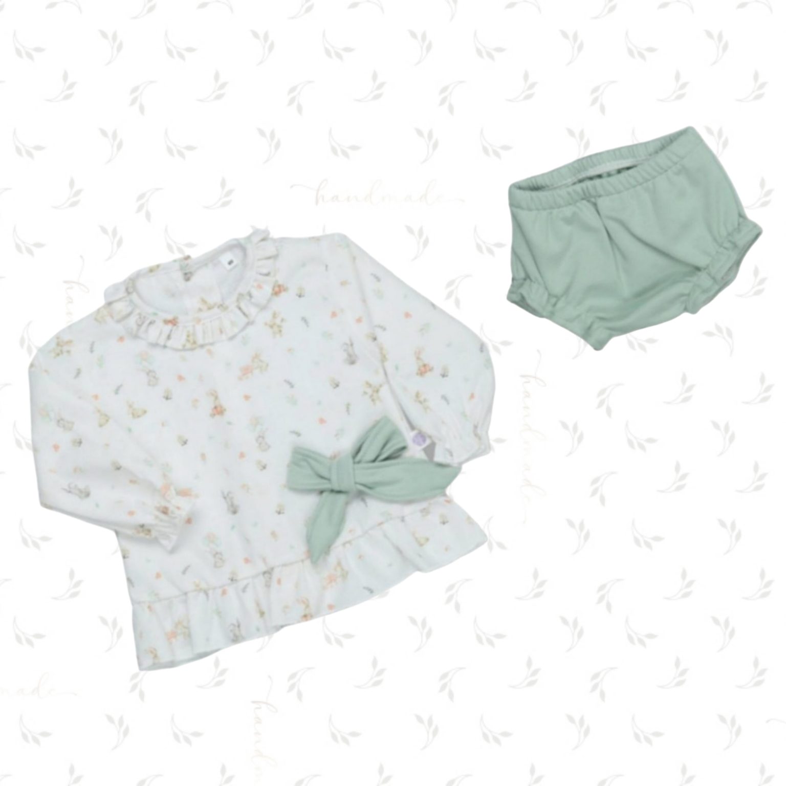 Conjunto composto por camisola e tapa fraldas cardado.